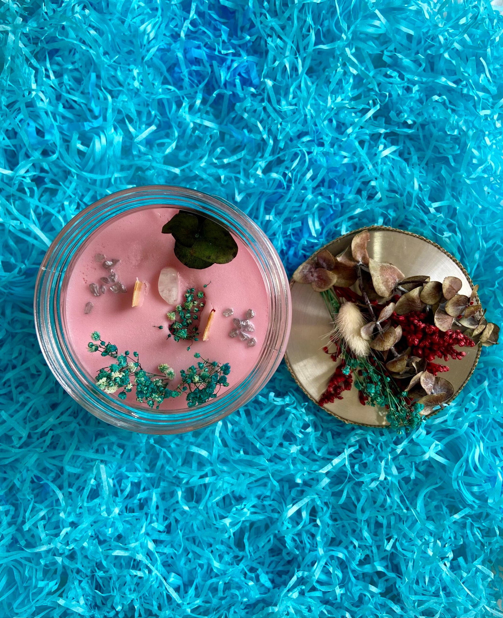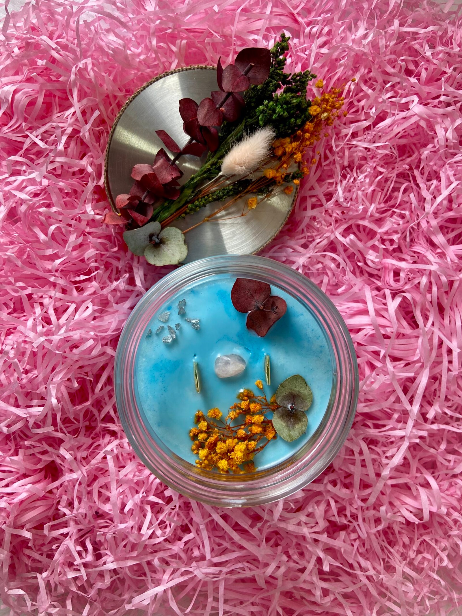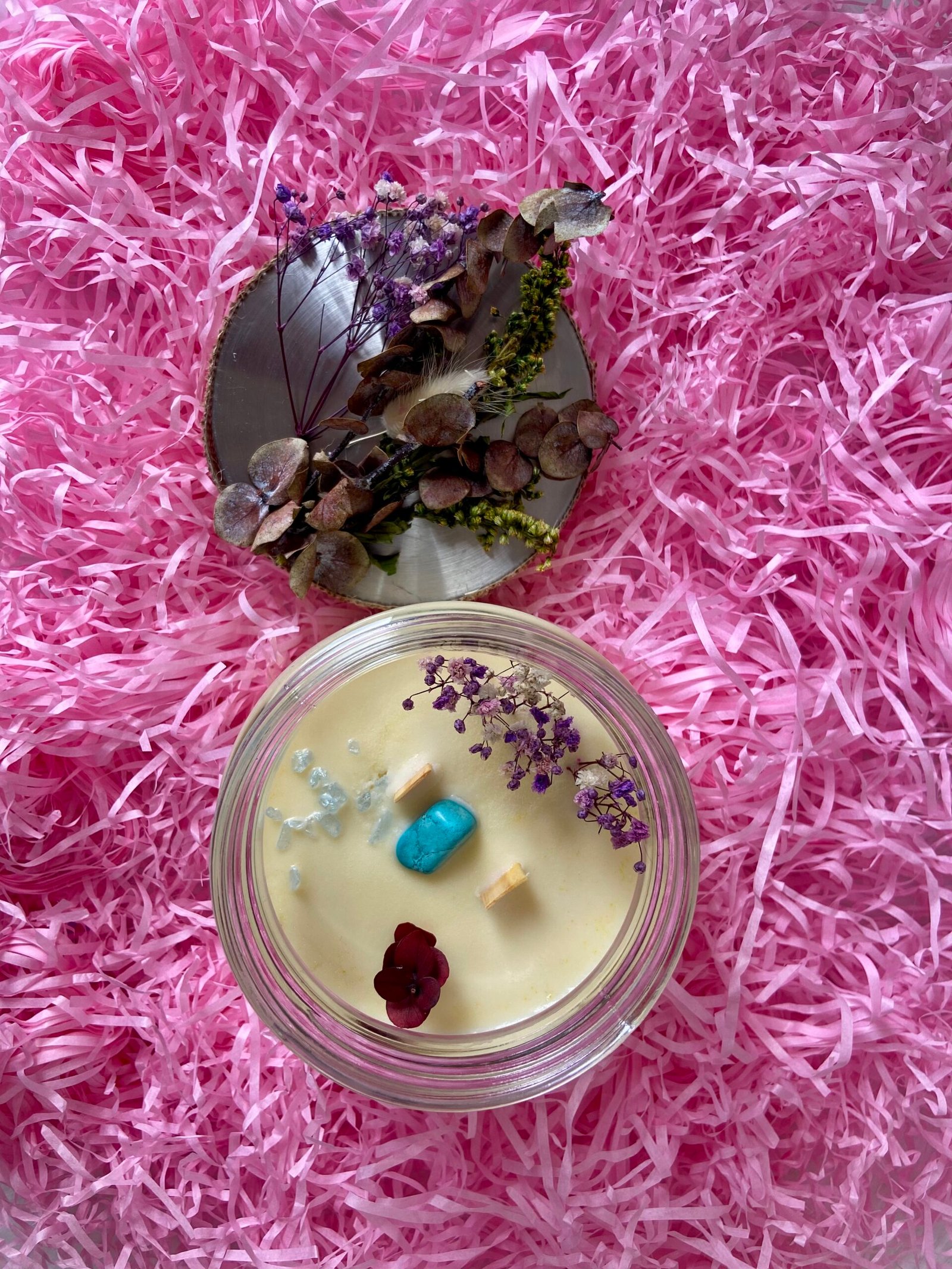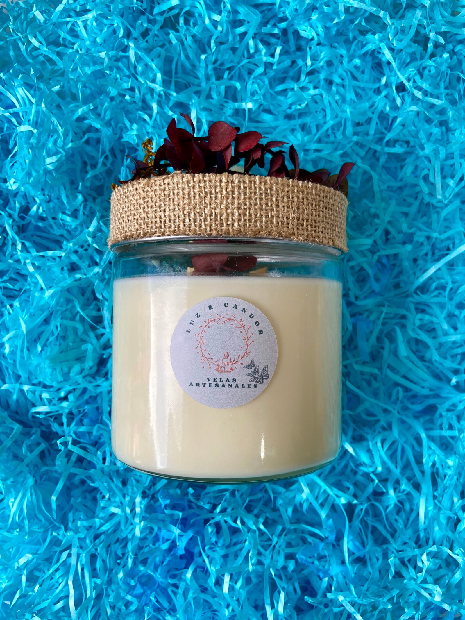 Elaboradas con cera de palma, ofrecen una combustión duradera y cada fragancia nos permite activar sensaciones de bienestar. Al ser velas en frasco de vidrio, se puede admirar la belleza de su quemado. Cuentan con decoración con flores inmortalizadas y cuarzos, lo que permite ser también un elemento de decoración.