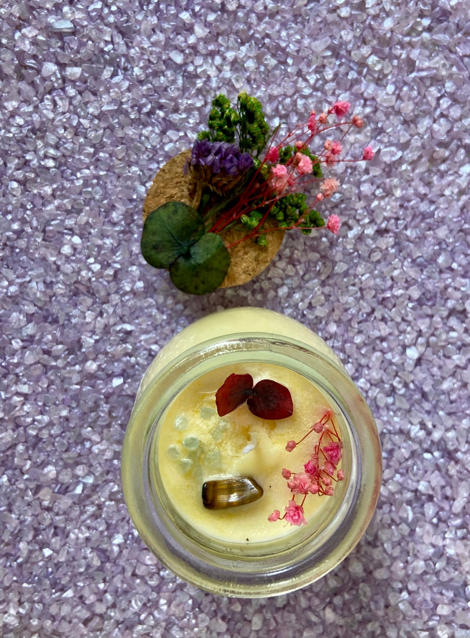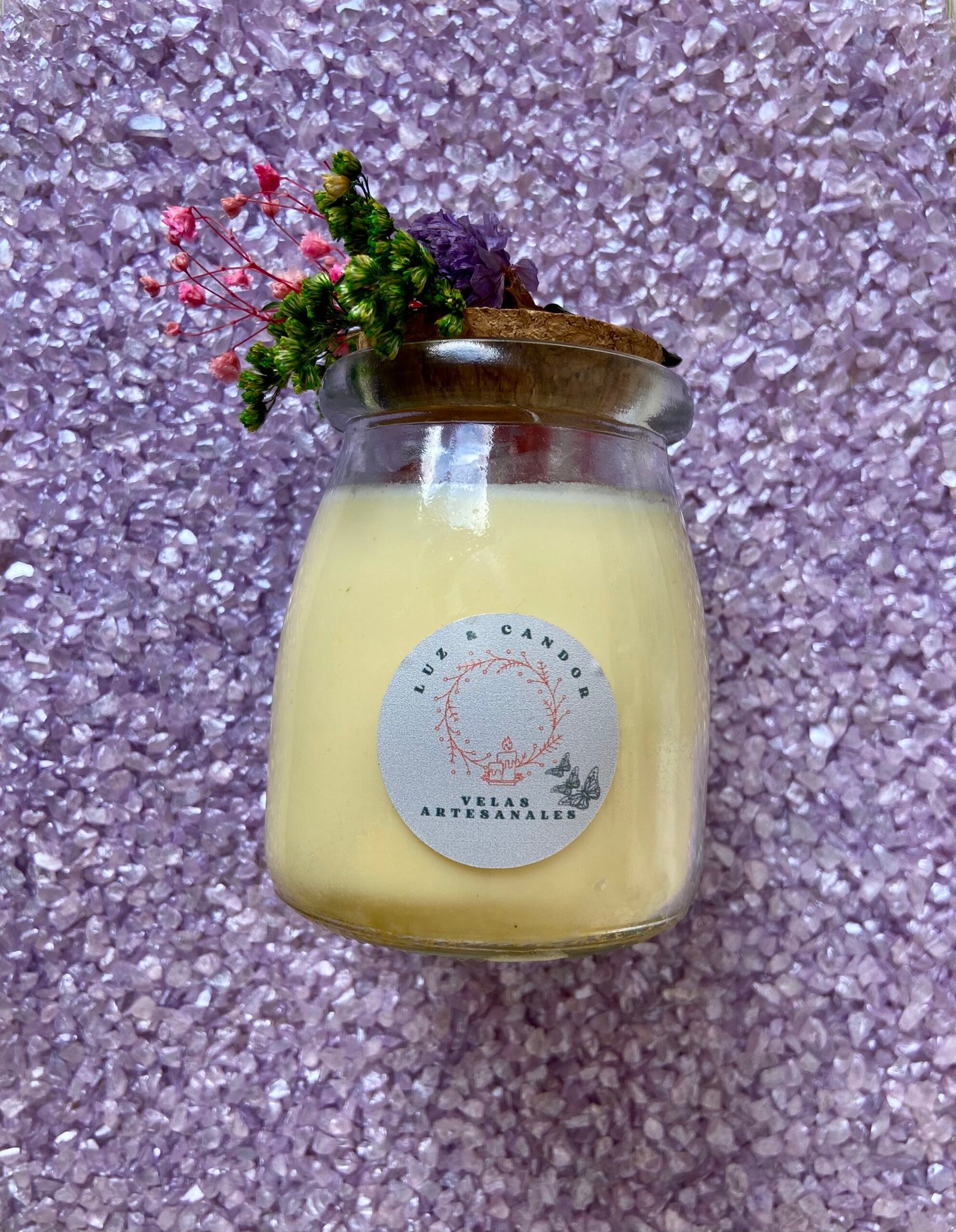 Elaboradas con cera de palma, ofrecen una combustión duradera y cada fragancia nos permite activar sensaciones de bienestar. Al ser velas en frasco de vidrio, se puede admirar la belleza de su quemado. Cuentan con decoración con flores inmortalizadas y cuarzos, lo que permite ser también un elemento de decoración.