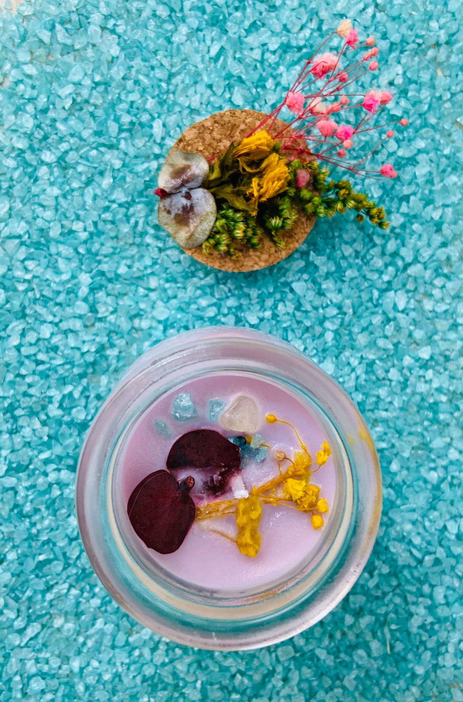 Elaboradas con cera de palma, ofrecen una combustión duradera y cada fragancia nos permite activar sensaciones de bienestar. Al ser velas en frasco de vidrio, se puede admirar la belleza de su quemado. Cuentan con decoración con flores inmortalizadas y cuarzos, lo que permite ser también un elemento de decoración.