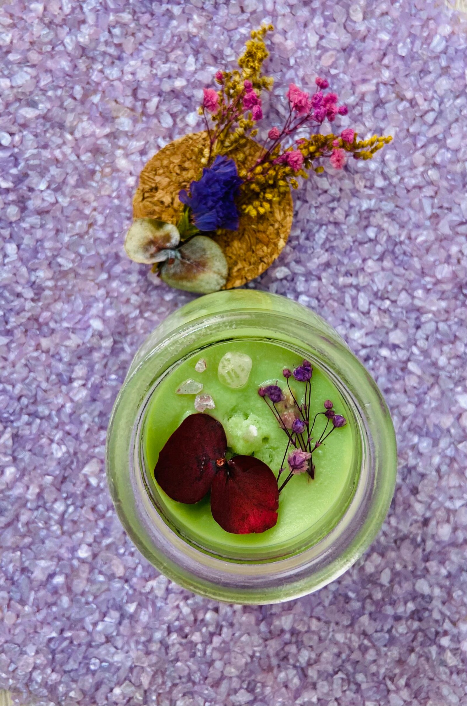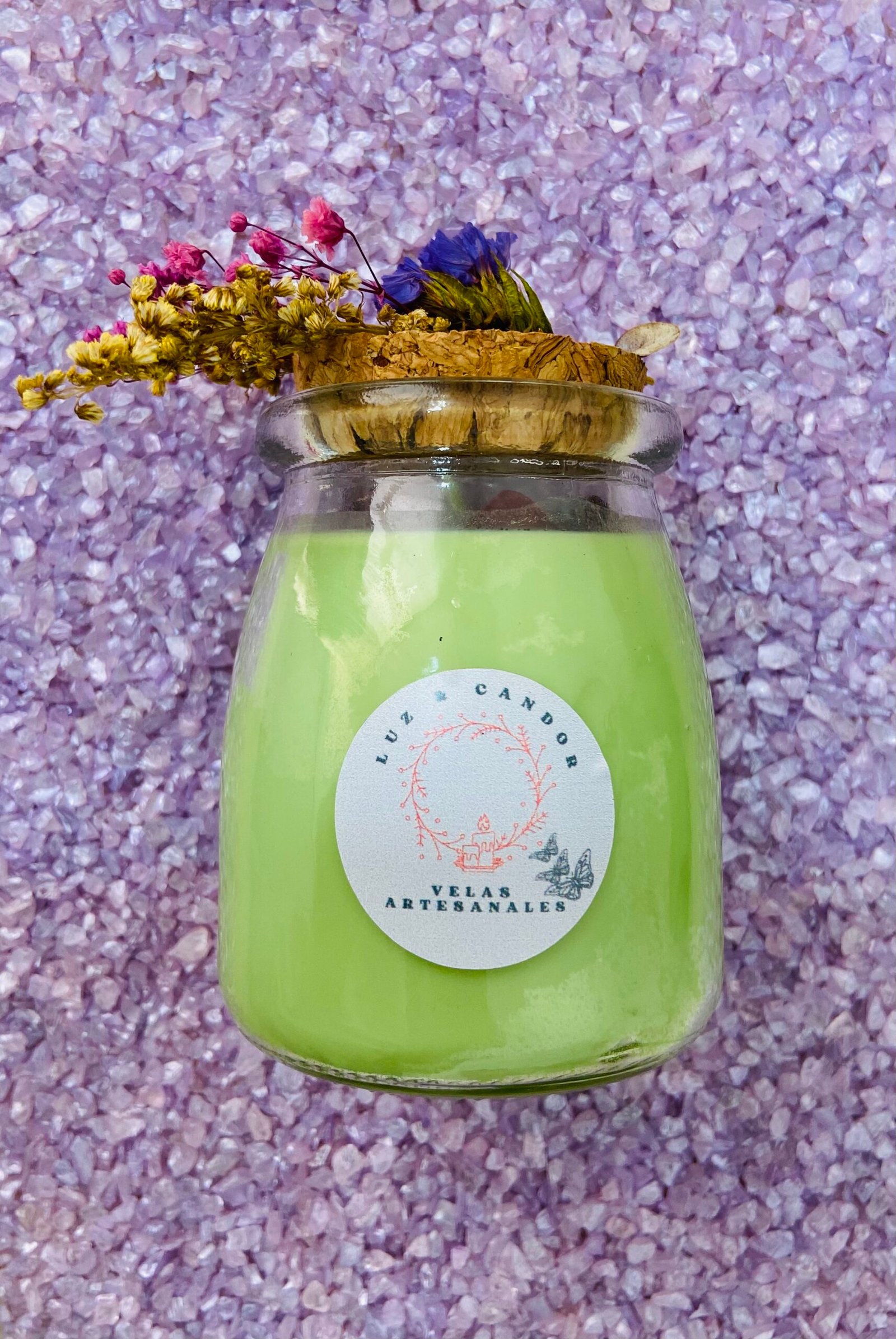Elaboradas con cera de palma, ofrecen una combustión duradera y cada fragancia nos permite activar sensaciones de bienestar. Al ser velas en frasco de vidrio, se puede admirar la belleza de su quemado. Cuentan con decoración con flores inmortalizadas y cuarzos, lo que permite ser también un elemento de decoración.